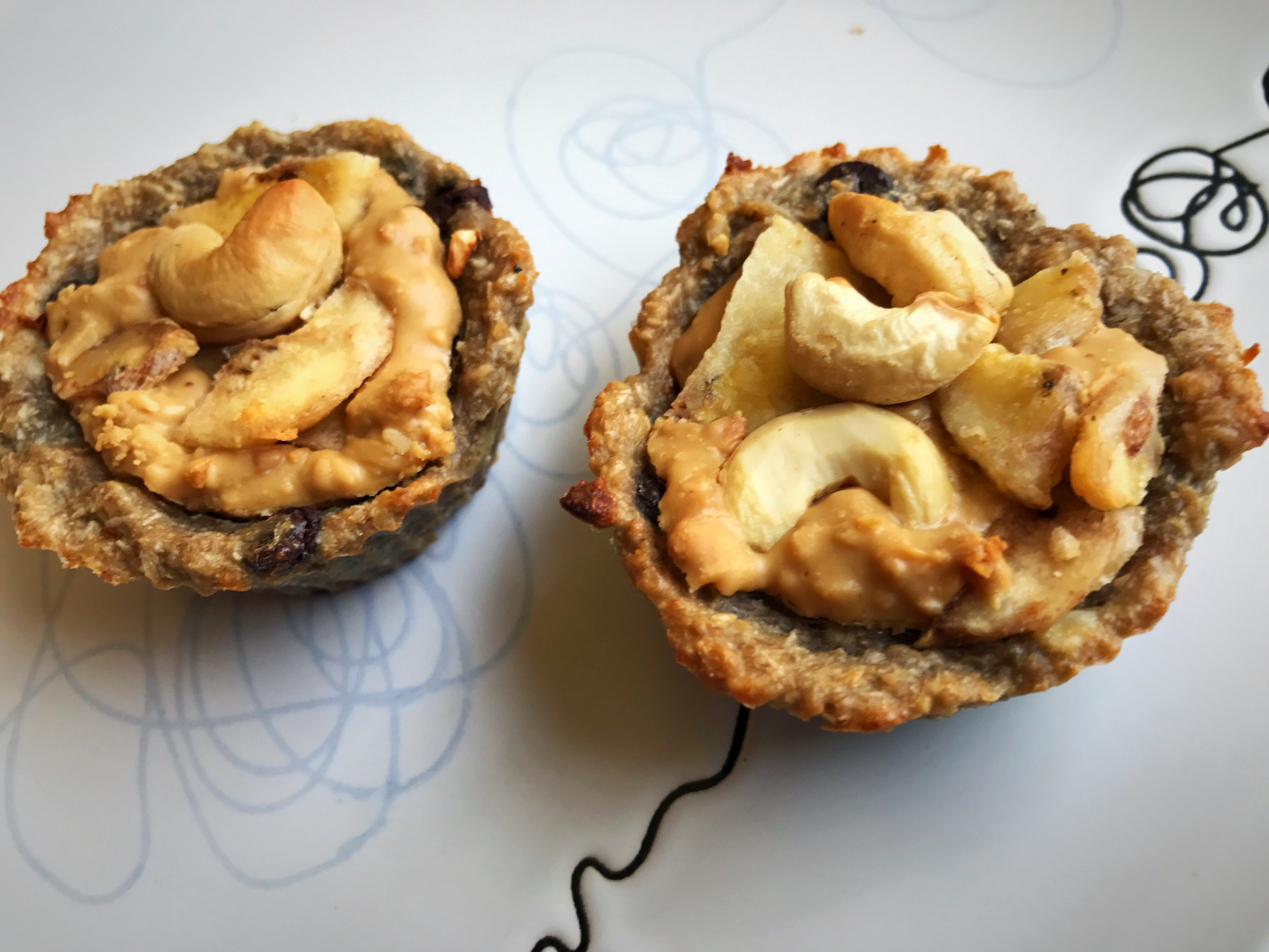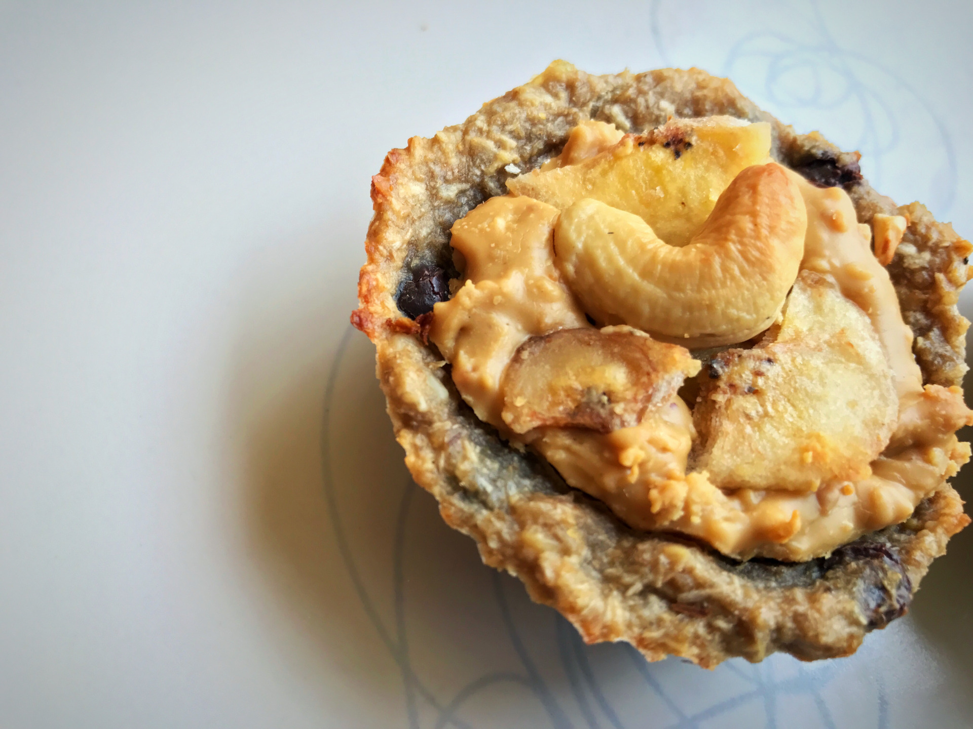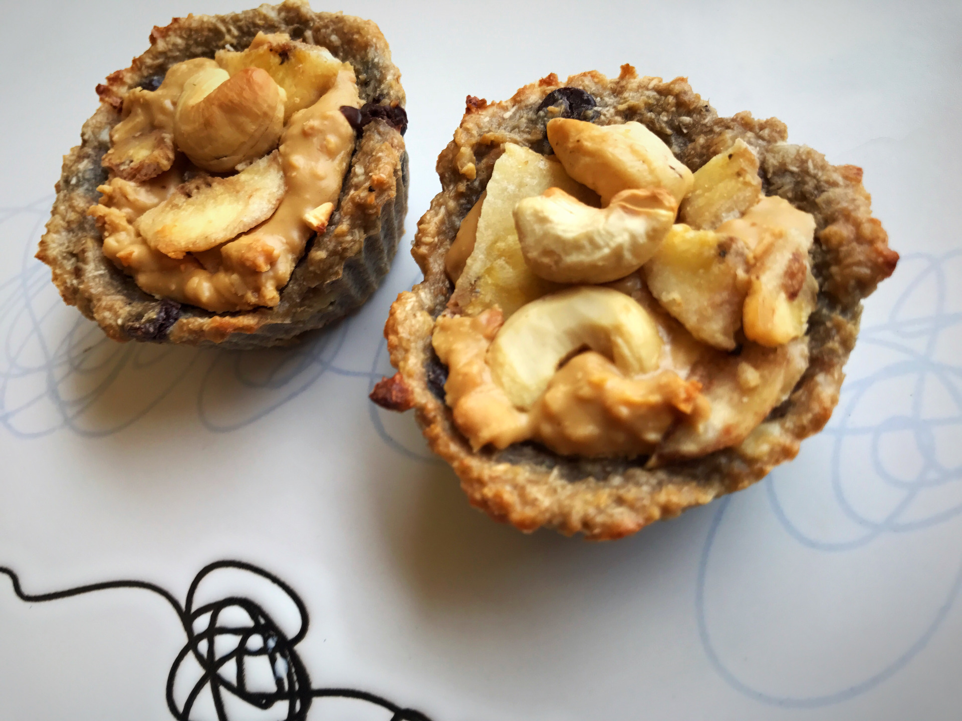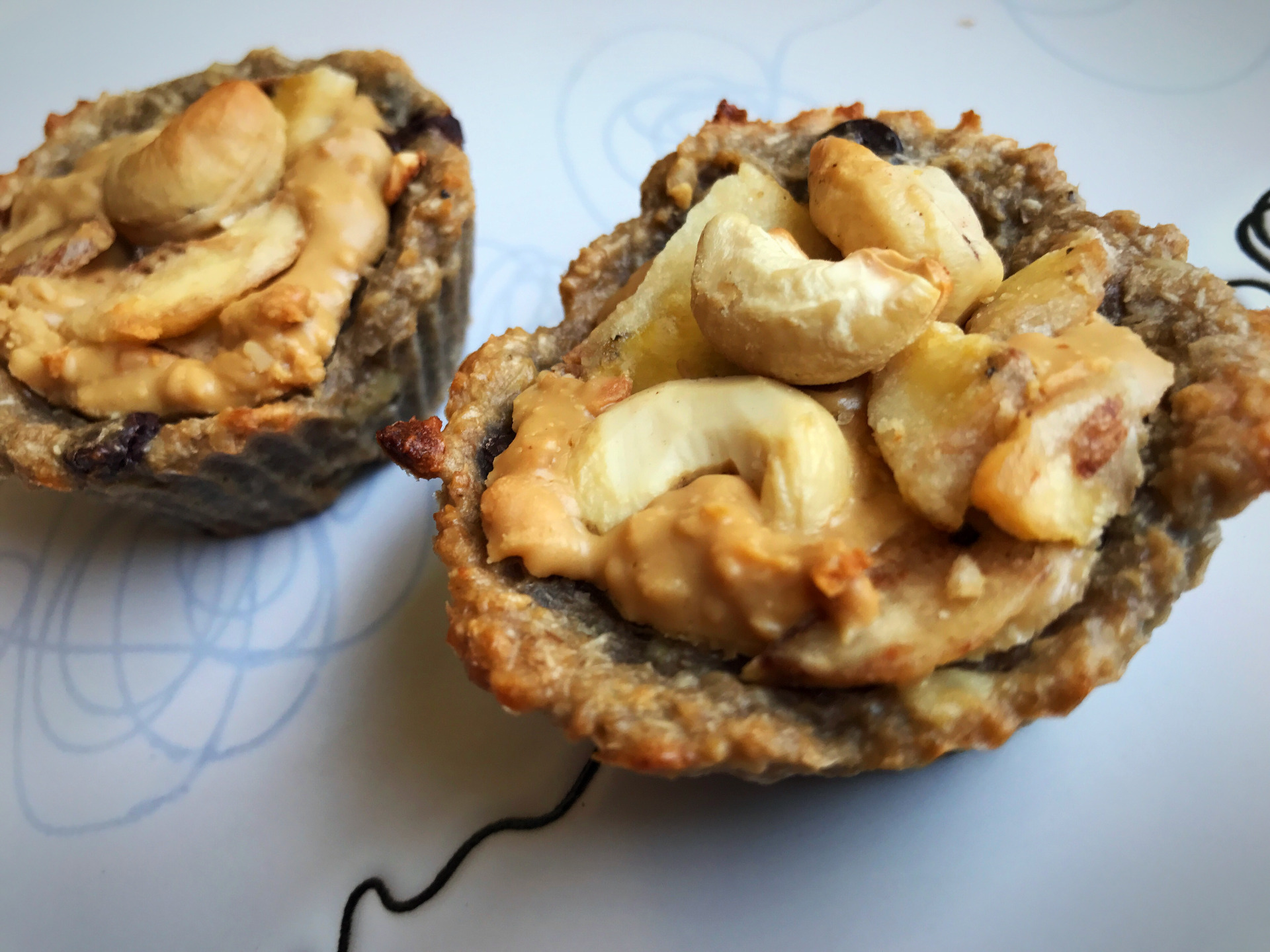 5. Keď sme si vytvarovali základ do foriem, tak ich naplníme 100% maslom buď arašidovým, alebo kešu maslom a k tomu pridajte aj kúsky sušených banánov a kúsky mixu orieškov. Kludne si môžete túto plnku pripraviť vopred a košíčky plniť už len hotovou plnkou.