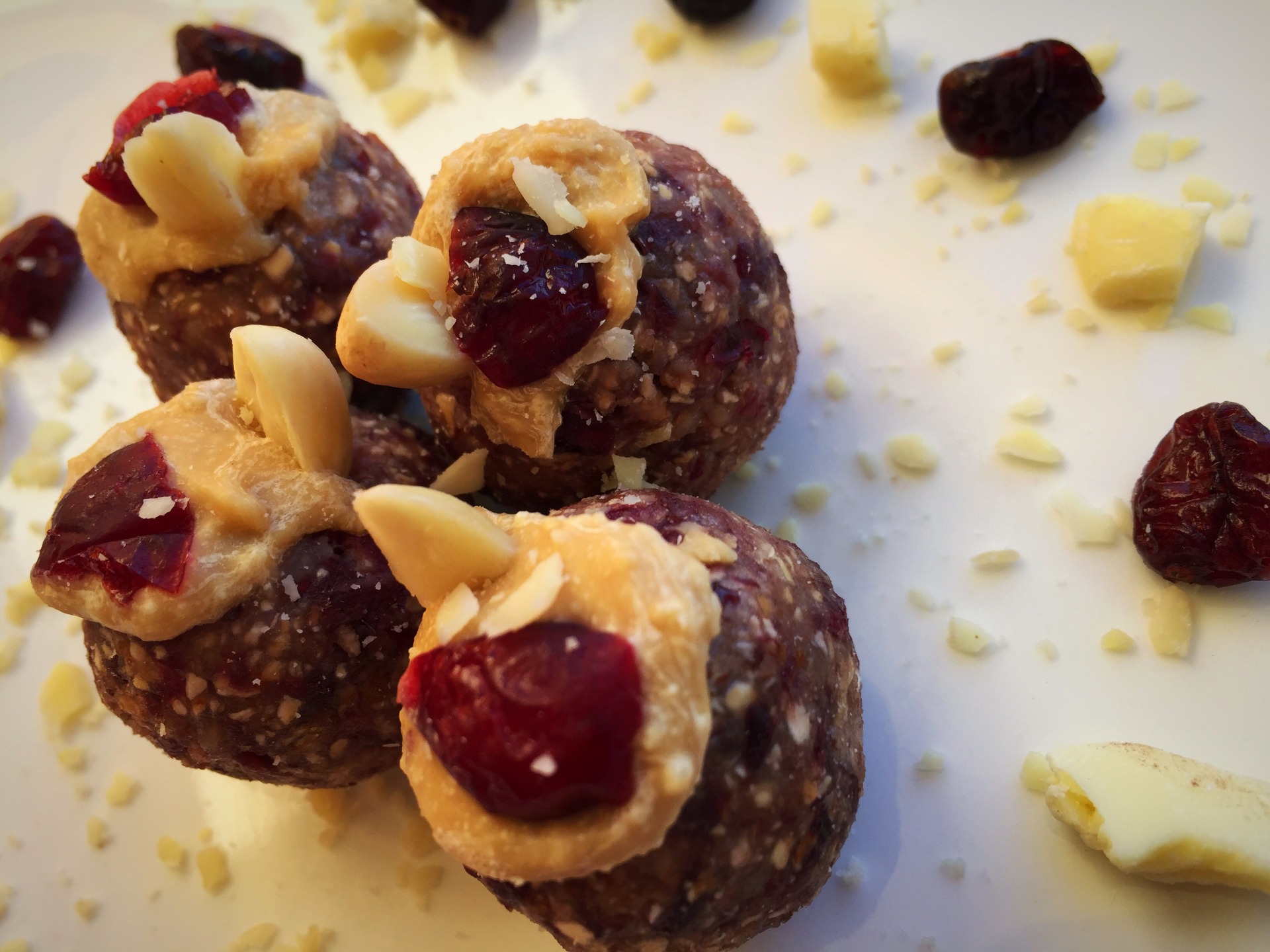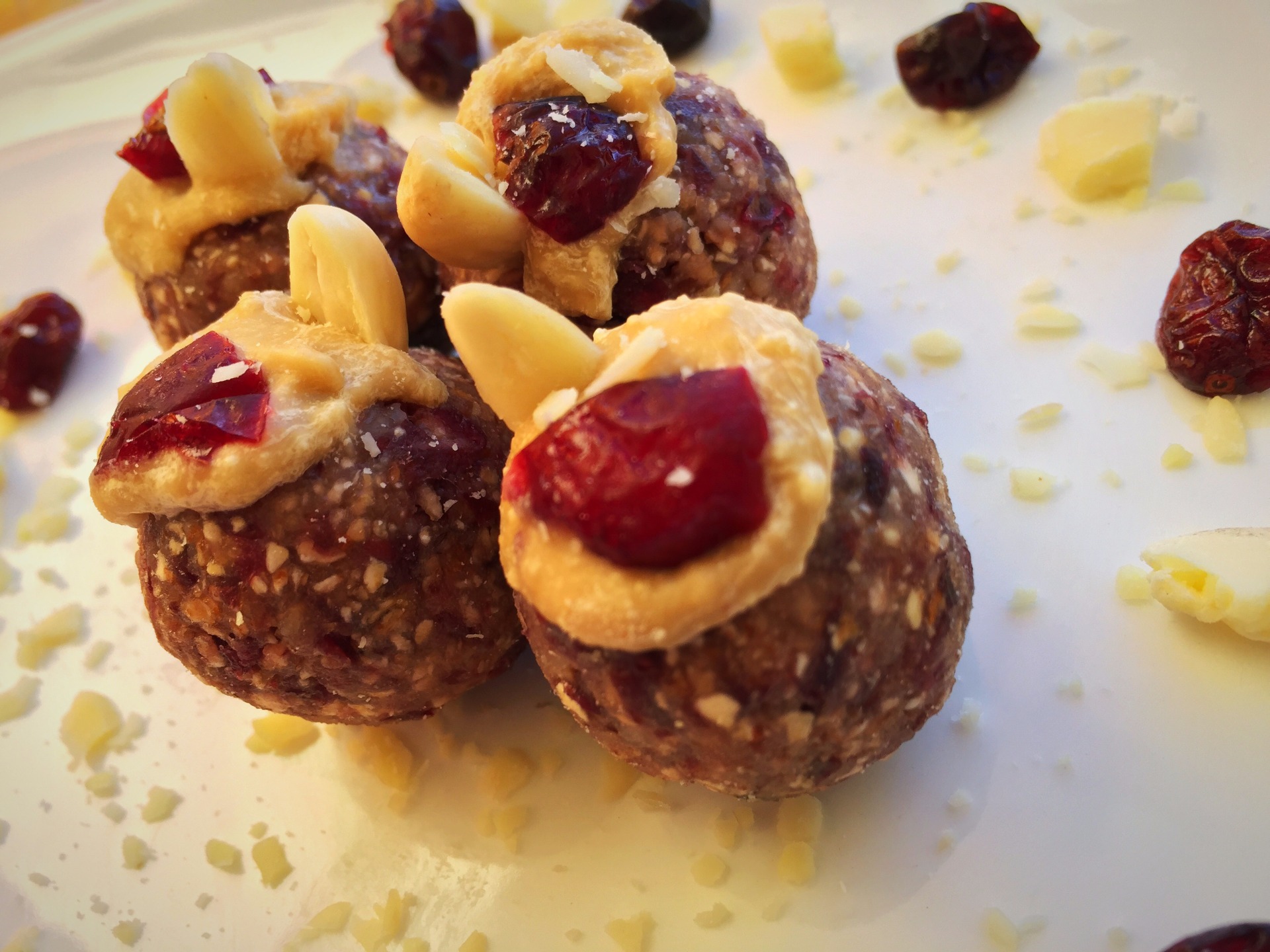 5. Z výlsednej tvrdej hmoty už len tvarujeme guľky, ktoré plníme jednou celou mandľou. Na vrch každej guľky som pridal trošku arašidovo-brusnicového masla, kúsok mandle a sušenú brusnicu. Po vytvarovní gulôčok ich vždy nechám v chladničke pred podávaním chvíľku odstáť.