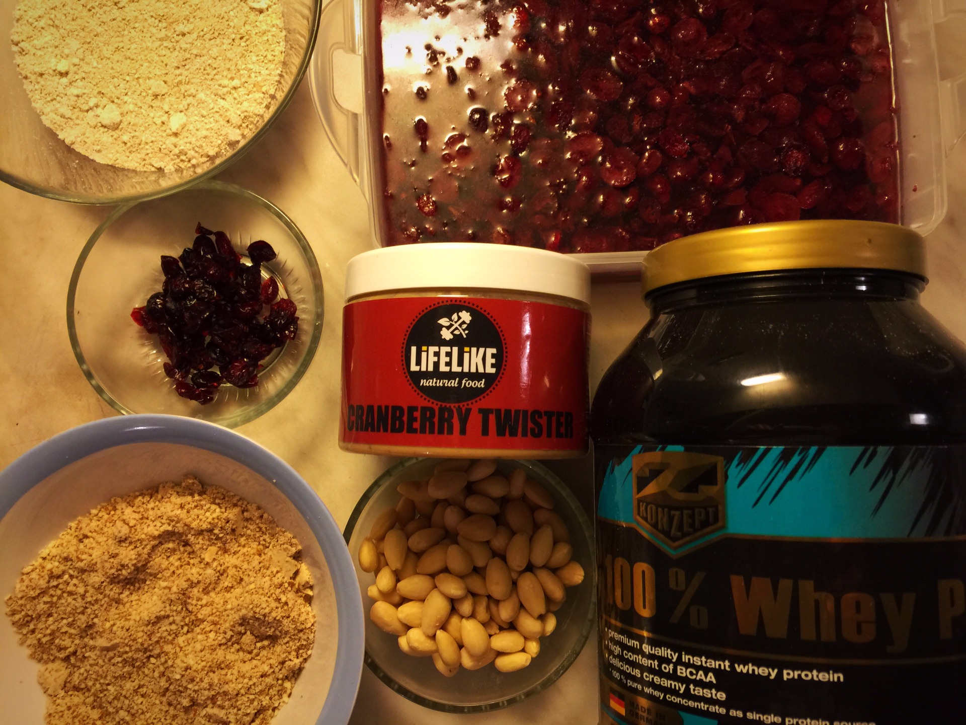 (s mandlami, proteínom a brusnicovým arašidovám maslom)