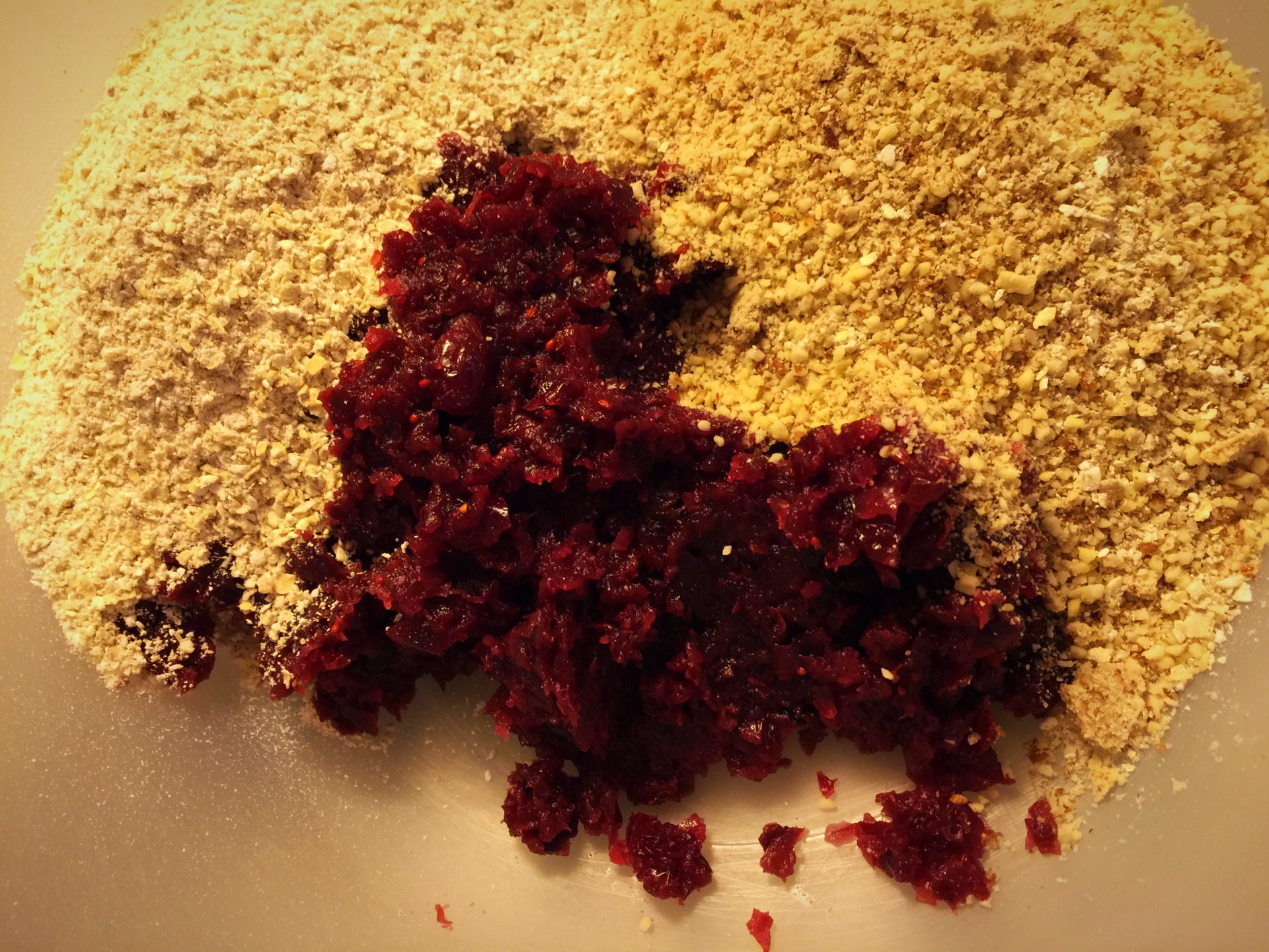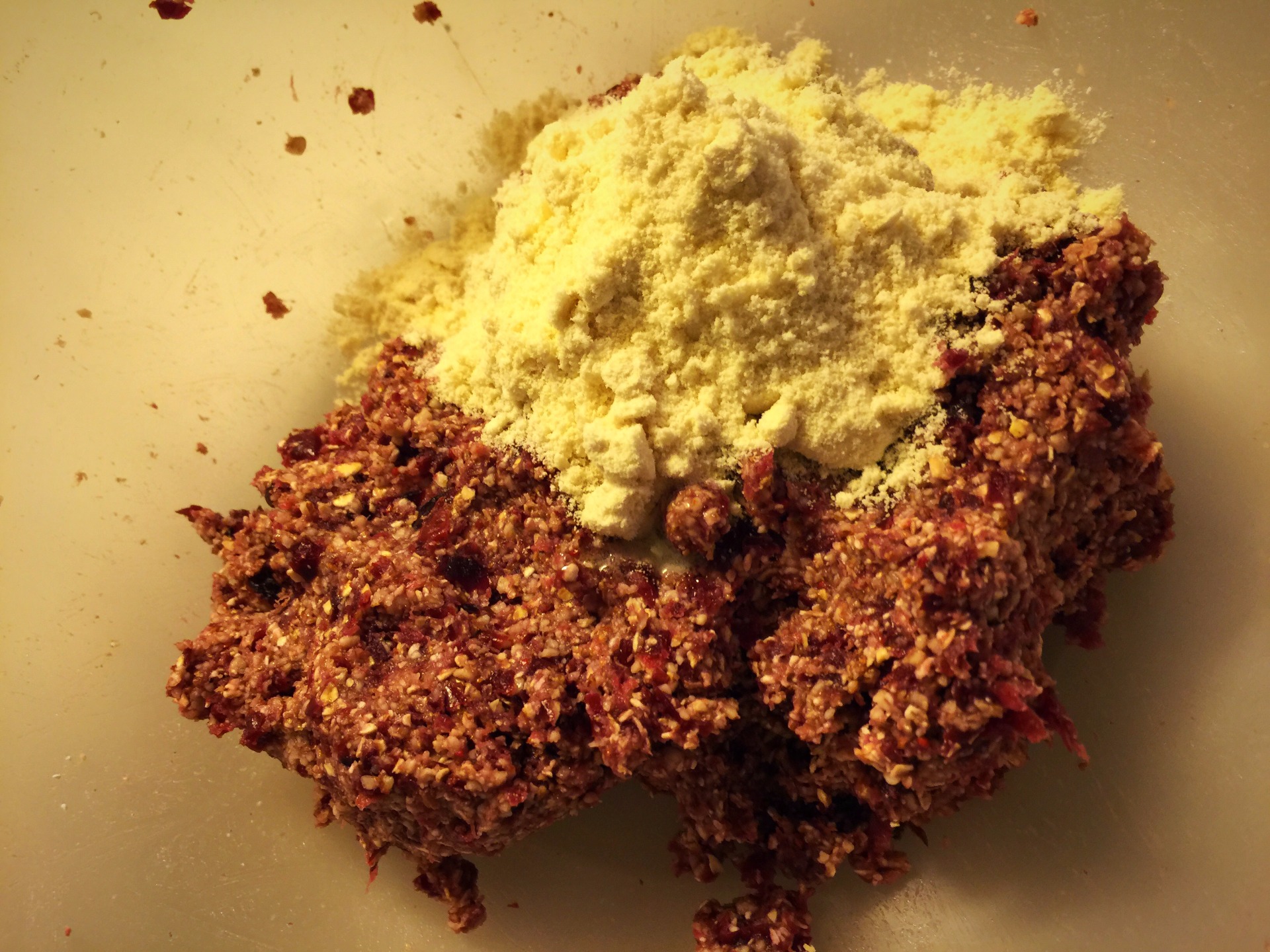 3. K pomixovaným brusniciam pridáme všetky múky, vanilkový proteín, sladidlo (môžete pridať aj trošku pomixovaných mandlí, ak chcete výsledný produkt chrumkavejší) a dôkladne premiešame rukami.