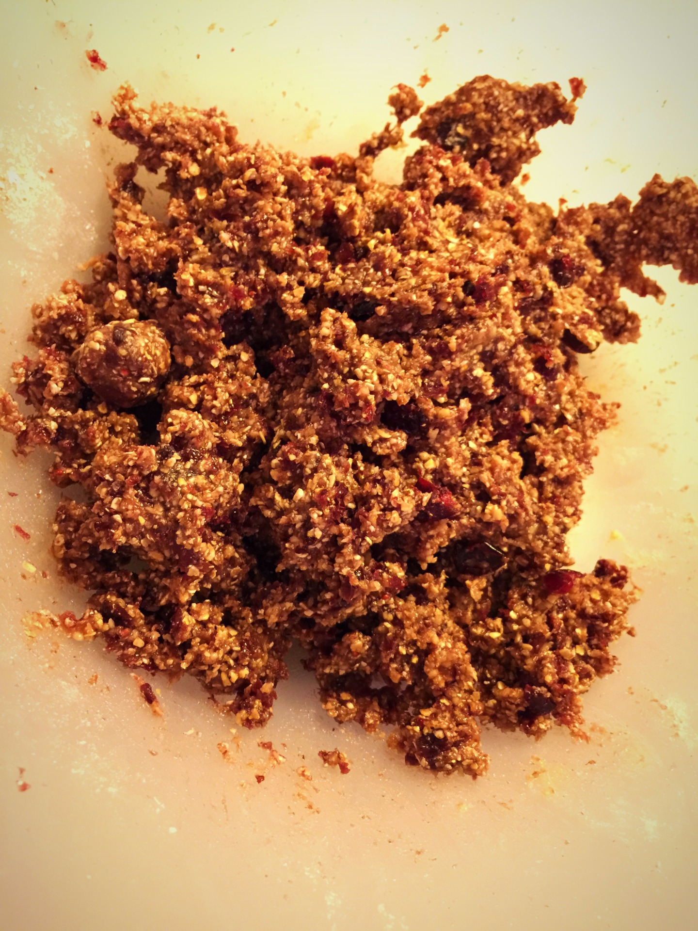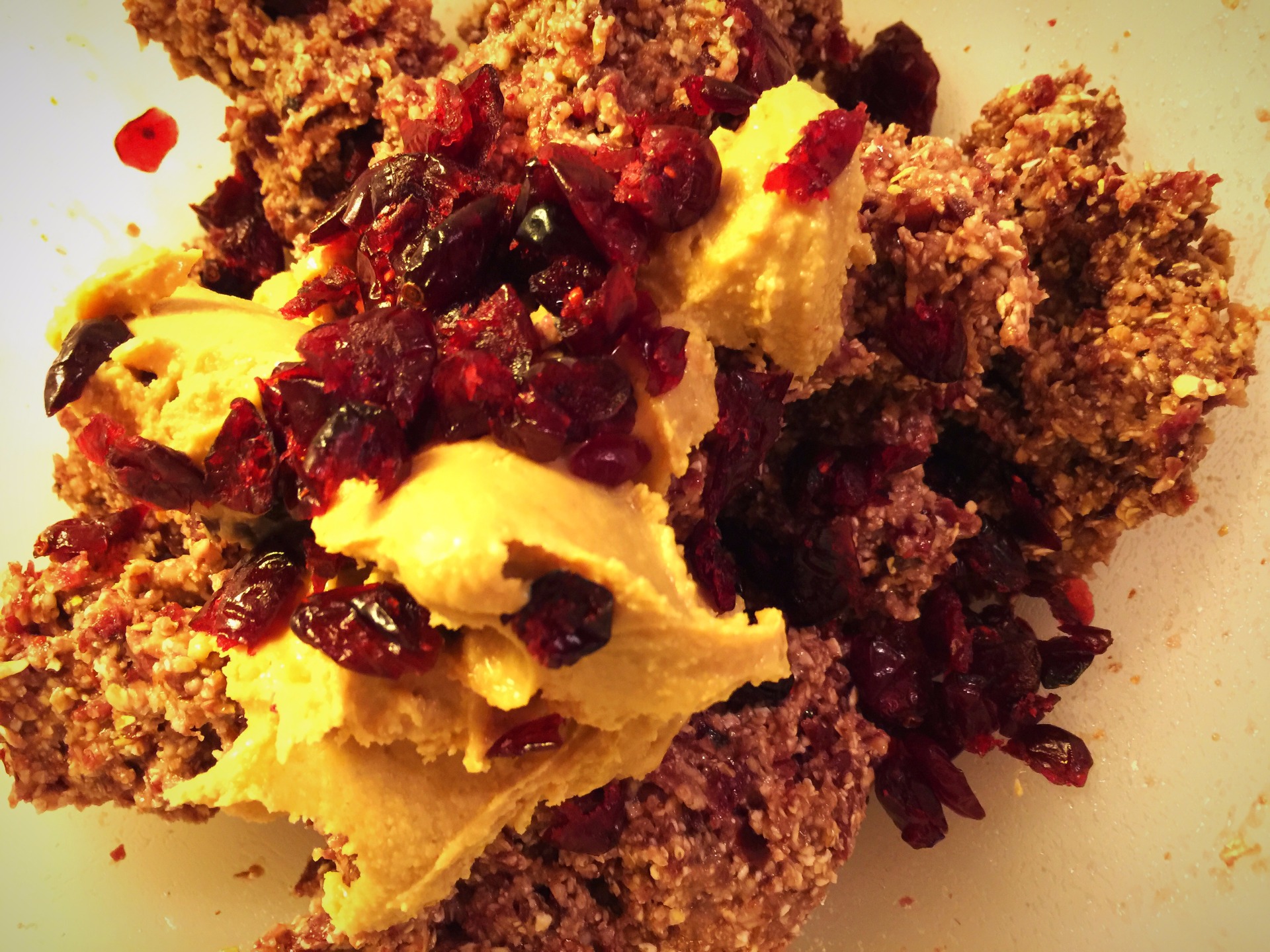 4. Keď si vytvoríme lepkavú hmotu pridáme ešte na zjemnenie trošku arašidovo - brusnicového masla aj spolu s celými kúskami brusníc a opäť dôkladne premiešame.